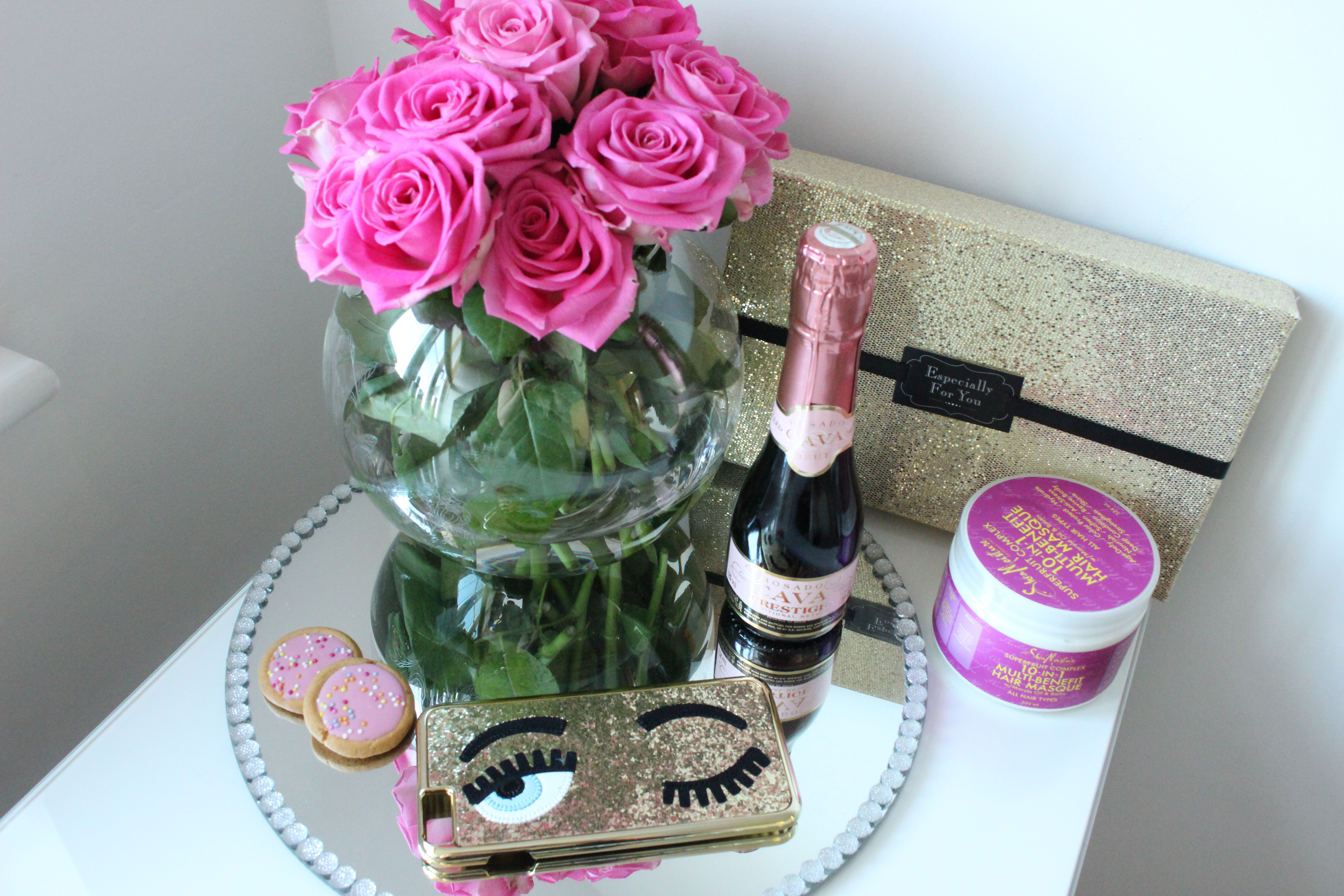 M & S pink Roses (here) | Miranda Kerr Rose Bowl Vase (here) | Mini Rose Cava | Glitter Phone Case (here) | Shea Moisture Hair Masque (here) | Silver Mirror Tray (here) |