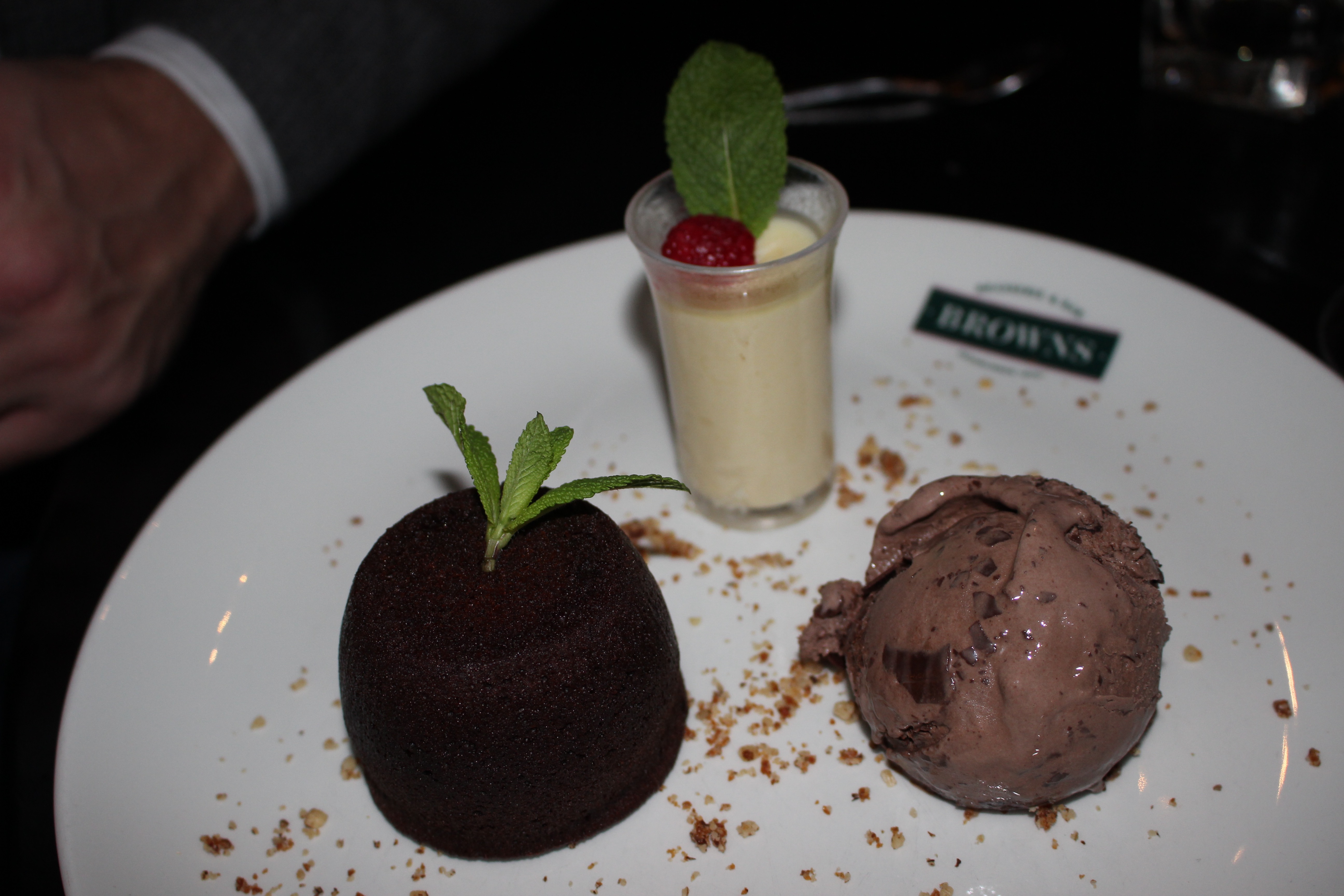 The seabass was light and lemony but I wasn’t a huge fan of the crab fondue that was served on the side. Simon ordered the chicken on a bed of risotto. Delish! The best part of date night of course is always dessert which in this case is a chocoholic’s dream. We chose the sharing platter which arrived with a trio of delicious desserts in miniature form. The chocolate fondant was a little on the cold side but it was incredible none the less. We ordered from the Valentine’s menu so I’m not sure if this dessert is available on the everyday menu but I did see incredible looking chocolate brownies floating past the table that I am going to go back just to try.