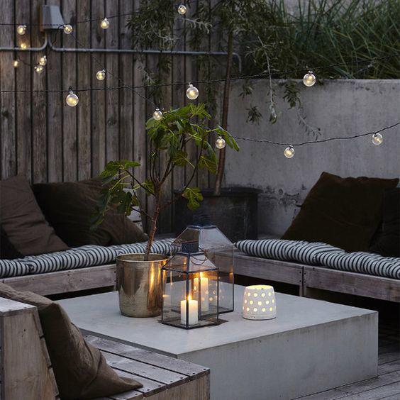 Bench seating is the next thing on our list. I want to to take up 3 sides of our square space with built-in bench seating as I love how rustic bench seating looks and it is a fairly simple DIY job (if Alan Titchmarsh is to be believed). You can also make it look all fancy with oversized cushions and blankets. I’ve been pinning lots of ideas and contemplating adding a statement feature such as a fire pit to make sitting out after dark a little cosier and a lot more atmospheric. Cue lots of lanterns and fairy lights.